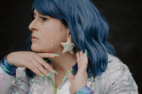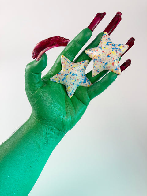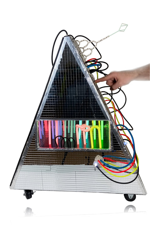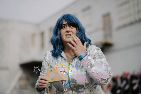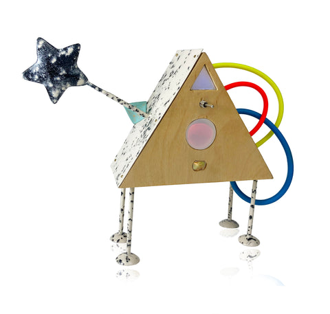 Rachel’s work has a strong foundation in Craft and material exploration. The materials incorporated in her work ranges widely and includes glass, metal, wood, latex, acrylic, polymer, leather, and small electronics. But the cornerstone of her artwork is humor and her sense of play. In this new series of work, primary colors and Memphis design have wiggled their way into her visual language. Rachel has departed from an organic aesthetic in favor of work informed by maximalism and pop art. In a post-pandemic post-Trump post-billionaire-space-odyssey world, she has come to fully embrace the important difference between artifact and artifice. The tangible necessity to employ candy colors and playful narrative in a world jaded by the misuse of the word “truth”. Rachel’s work rides the line of fact and fiction presenting her work in a performative context, her socio-political motivations buried within the driving force of her creations, only observed by a discerning eye. This series of work is a playful presentation of artifice: a presentation of Our origin story and the tools needed to excavate these “truths”.