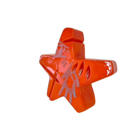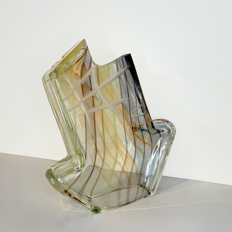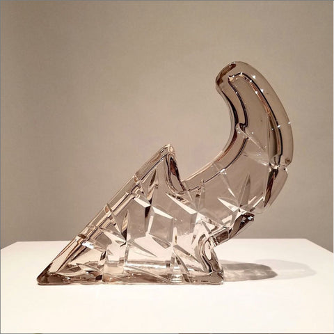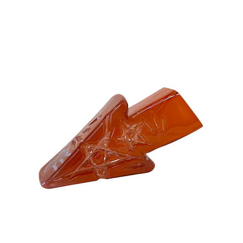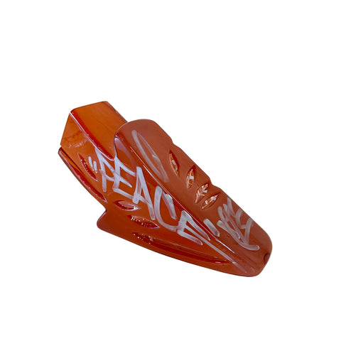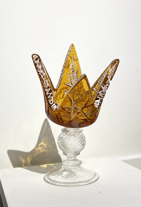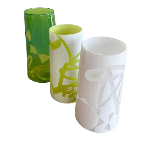 Tecosky has mastered various blown glass and hot sculpting techniques to form his stylized abstractions that clearly salute his love of hip hop and graffiti. Also being honored in his work is the craft of blown glass. Traditional processes are celebrated over and over again. From intricate carved line work to a humble nod to the venetian goblet, Leo’s dedication to the craft is steady. From this foundation, he has continued to explore how these themes overlap with other cultural interest points. These questions are carved into and layered onto the surface of his forms. Text based meditations can be found on most surfaces seeking and sometimes pleading for truths. Much like his recurring arrow, familiar geometric patterns have entered the surface: octagrams sourced back to ancient petroglyphs share space with wild style stars and of course, the artist’s own tag: TECO.