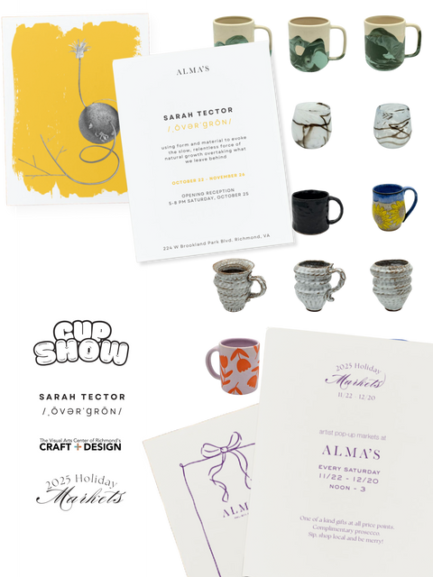 Our 2025 Cup Show launches Alma’s Fall/Winter programming. The 1000+ piece exhibition opens September 19 and runs through October 18. This celebratory show feels a whole lot like a hug and is the perfect way to set the tone for the next few months which will no doubt pass in a blur.