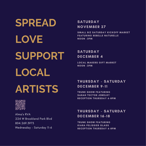 Starting on Small Business Saturday (the Saturday after Thanksgiving) Alma's will be hosting weekly events to help you make the most of your holiday shopping. No need to worry about cargo ships and their schedules here, instead you have the chance to meet the maker yourself, have some fun and support your local community all at the same time. Feels good, right? Join us!